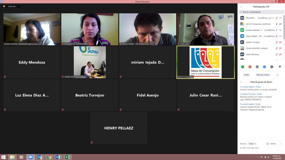 El 12 de agosto se realizó la reunión del grupo de trabajo Agua y Gestión Ambiental, que forma parte de la Dimensión Ambiental de la MCLCP Región Amazonas para realizar el seguimiento al avance de la Meta 10: La Autoridad Regional Ambiental (ARA) funciona como Unidad Ejecutora y de la Meta 15: Mantener el porcentaje de hogares que consumen agua con tratamiento de cloro; dos de las metas priorizadas del Acuerdo de Gobernabilidad 2019- 2022 de nuestra Región en temas ambientales.