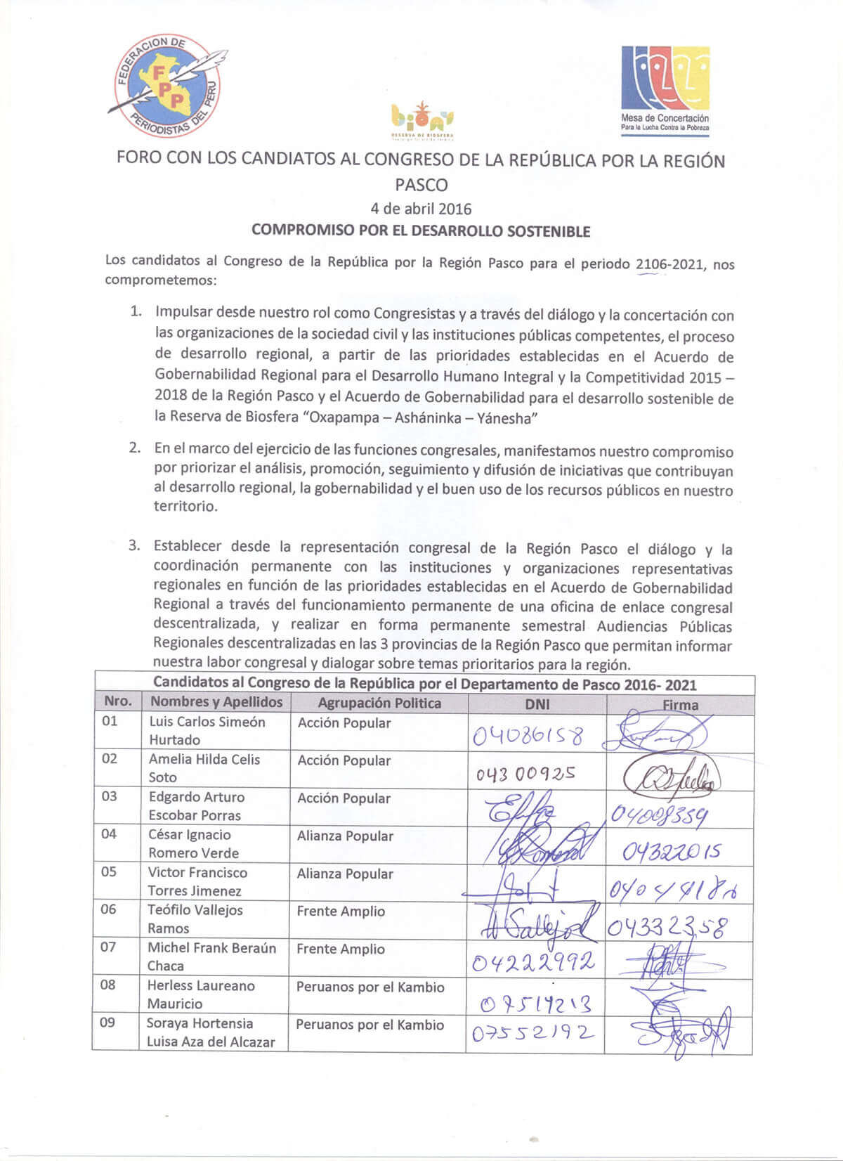 Ratificación del Compromiso Político de Acción Parlamentaria 2016 - 2021 por el Desarrollo Humano Integral y la Competitividad de la región Pasco