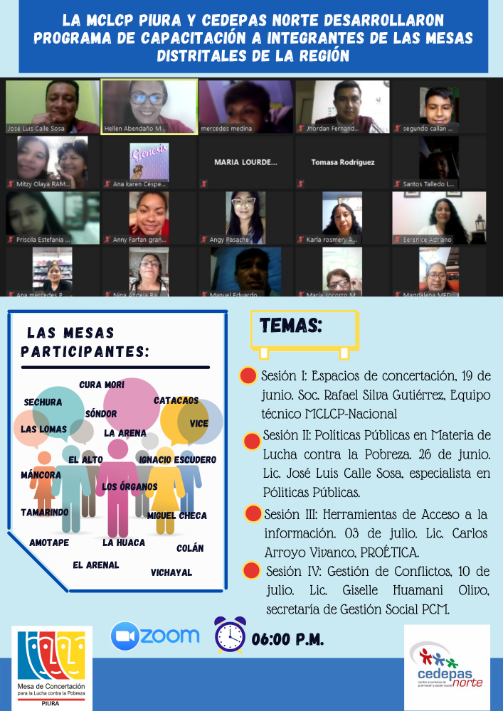 La MCLCP Piura y CEDEPAS Norte, desarrollaron un programa de capacitaciones para el desarrollo y fortalecimiento de capacidades, para una eficiente participación en los espacios de concertación y toma de decisiones en sus territorios, dirigida a los integrantes de las mesas distritales.