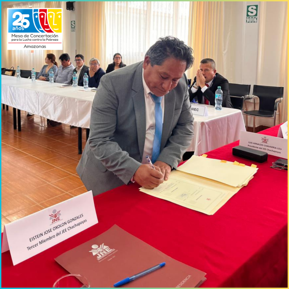 La suscripción del pacto fue realizada por el Coordinador Regional de la MCLCP Amazonas, Antonio Serván Picón, acompañado del equipo técnico regional, reafirmando el compromiso institucional como entidad adherente a esta iniciativa impulsada por el Jurado Electoral Especial (JEE) del Jurado Nacional de Elecciones (JNE).