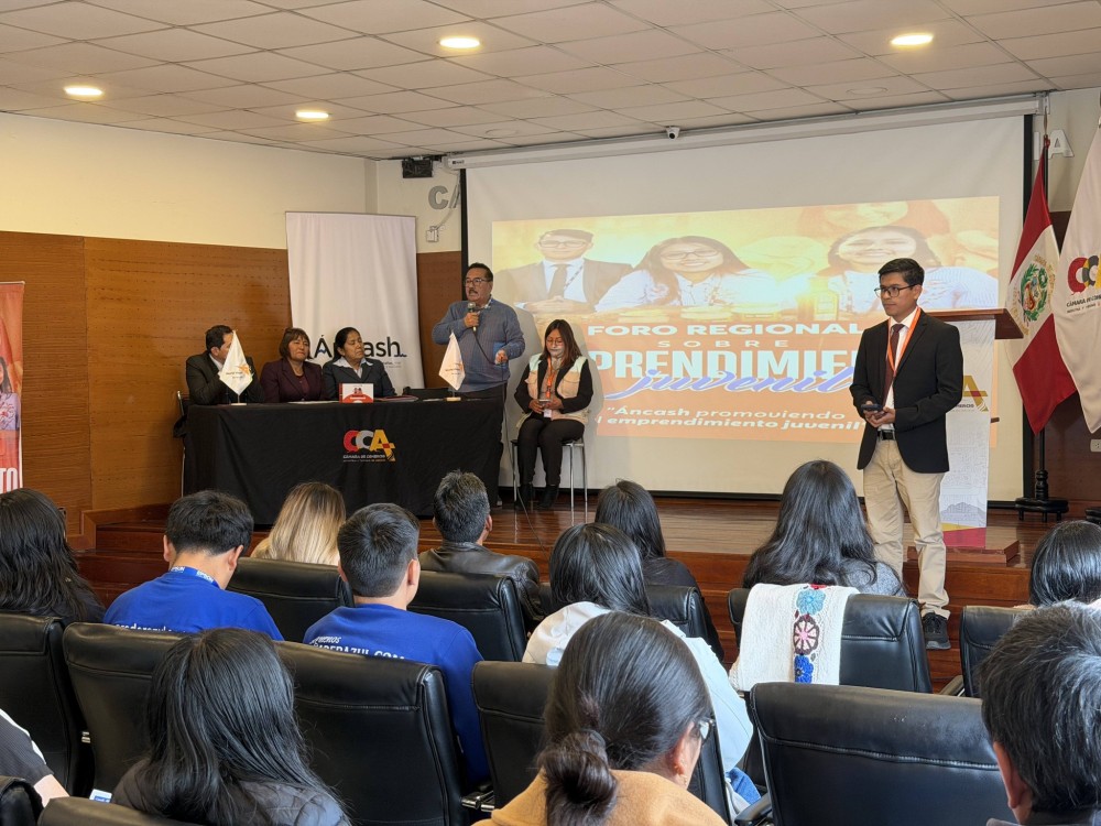 Áncash, 13 de marzo de 2026.– Luego de diversas reuniones de trabajo, la Mesa de Concertación para la Lucha contra la Pobreza (MCLCP) Áncash participó en el Foro Regional: “Promoviendo el emprendimiento juvenil en Áncash”, realizado en el auditorio de la Cámara de Comercio, Industria y Turismo de Áncash, con el objetivo de promover oportunidades laborales, formativas, de emprendimiento y voluntariado para jóvenes de 15 a 19 años, con énfasis en quienes no estudian ni trabajan ("ninis").