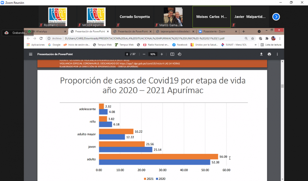 En el segundo punto sobre la situación sanitaria de la región y plan frente a 2da y 3era ola por la pandemia COVID-19, estuvo a cargo del Lic. Moisés Huaraca Aedo, de la Dirección de Epidemióloga- DIRESA Apurímac, quien señalo que al 21 de junio del 2021 la región Apurímac ha descendido de manera significativa en las últimas 4 semanas, periodo en el que se debe aprovechar para reforzar las medidas de contención y fortalecer los servicios de primer nivel de atención en espera de la 3era ola pandémica, con dotación de recursos humanos, materiales, insumos, equipos, medicamentos y oxígeno, que garanticen la lucha contra la pandemia.