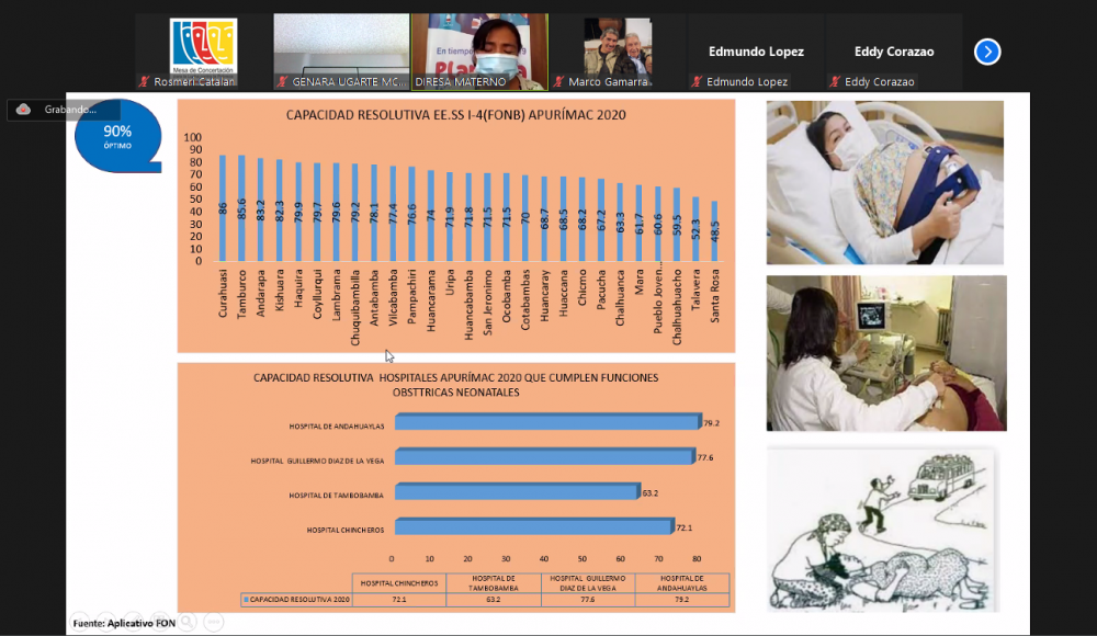 Por otro la presentación de la situación de muertes maternas en la región Apurímac en contexto de la pandemia COVID-19, estuvo a cargo del Obst. Valentina Olivera Pacori, Coordinadora de Estrategia Sanitaria de Salud Sexual Reproductiva de la DIRESA Apurímac, quien detalló que de acuerdo a los objetivos de desarrollos Sostenibles se tiene que para el 2030, a nivel del Perú la meta es reducir la mortalidad materna a menos de 41 por 100000 nacidos vivos. La tasa mundial de mortalidad materna se da por diferentes causas, dividiéndose específicamente en 2 lados, el visible y el oculto. El lado visible son las causas etiológicas que se dan por aborto, infecciones, hemorragias, preclamsia o parto obstruido. El lado oculto son las causas condicionantes como la pobreza, discriminación analfabetismo, creencias, etc. Actualmente en la región Apurímac hay 7 muertes maternas (6 más que el año pasado), lo que es una alerta, ya que 3 de las muertes se dieron por un débil trabajo preventivo. Además se indicó que se tiene mejorar la capacidad resolutiva de los centros de salud.