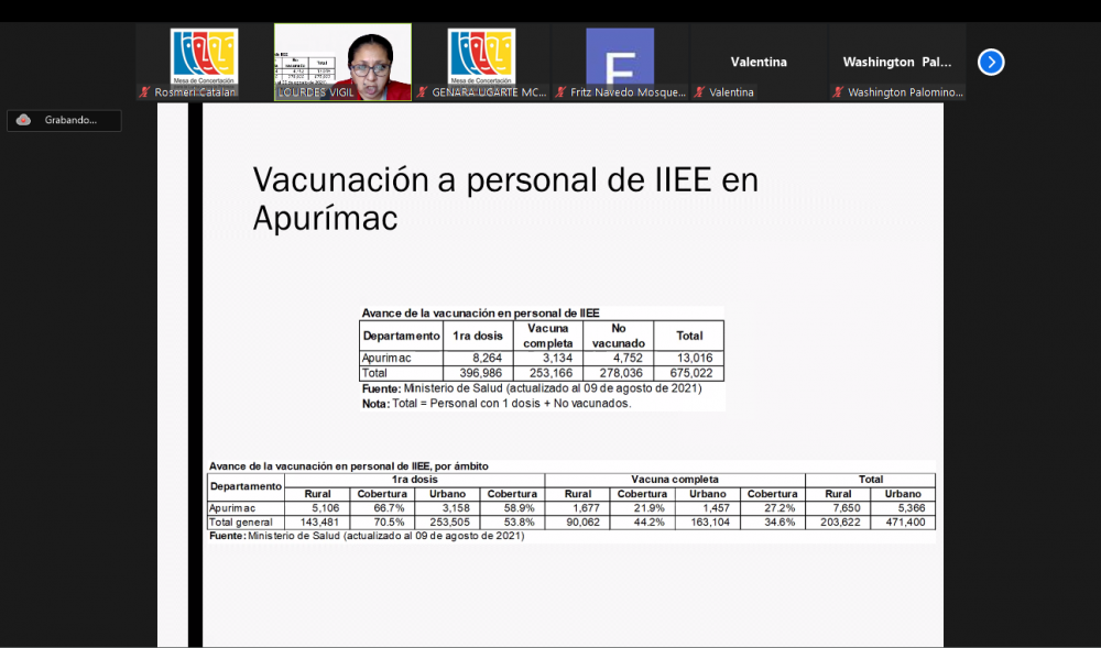 La segunda exposición estuvo a cargo de la Mag. Lourdes Vigil, Directora Regional de Educación, quien presentó las condiciones del desarrollo de la educación a Distancia, la intervención y lo que se pretende en el nuevo ciclo. Actualmente en la región se tiene 124,477 estudiantes de los cuales 62,444 son del área urbano y 62,033 son del área rural. También se habló de la dotación de tabletas a los estudiantes para facilitar el acceso a sus clases virtuales, además se sabe que el 30% trabaja con estas tabletas, el 48% posee internet en casa, el 11% sigue sus clases a través de tv y radio y el otro 11% con impresiones. Al finalizar su presentación solicito el apoyo a la MCLCP realizar el seguimiento para establecer las condiciones hacia la semipresencialidad, así mismo se requiere de Salud y el GORE para garantizar la vacunación de todos los docentes y el apoyo de los padres de familia para guiar a sus hijos en la educación.
