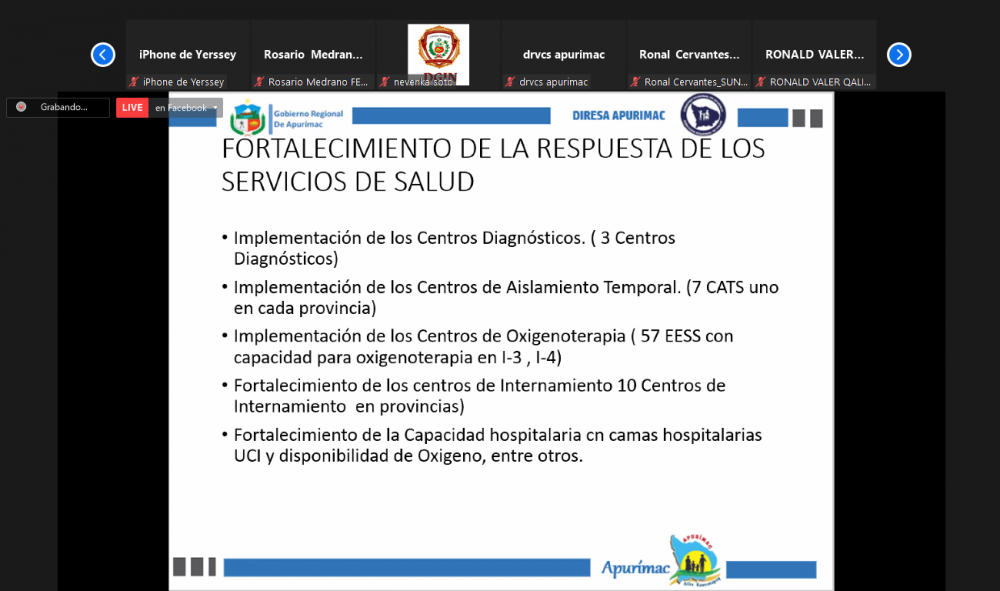 Seguidamente en representación de la DIRESA, el Medico Roger Peralta, realizo la presentación del plan de preparación y respuesta ante posible tercera ola pandémica por covid-19 en Apurímac 2021-2022, indicando que en Apurímac se estaría estimando 14,976 casos probables en una tercera ola, se presentaría 1,512 hospitalizados, y posibles 130 pacientes que requieran camas UCI, y la posibilidad de hasta 491 fallecidos. Luego de haber visto las otras variables que se presentarían en la tercera ola, como oxígeno, infraestructura hospitalaria y la capacidad de las redes y establecimientos de salud, se dio a conocer los lineamientos de intervención, cuyo monto de implementación ante la posible tercera ola asciende a S/. 45 millones de soles.
