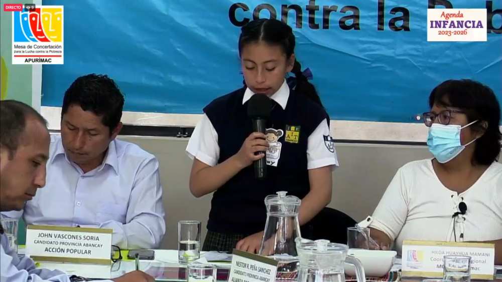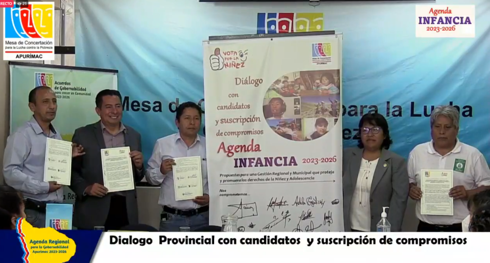 El martes 20 de setiembre, la Mesa de Concertación para la Lucha Contra la Pobreza de Apurímac, organizó el diálogo para la suscripción de compromisos de la Agenda Infancia para la protección y promoción de los derechos de los niños, niñas y adolescentes 2023-2026, con candidatos que postulan a la Municipalidad Provincial de Abancay, en el marco de las Elecciones Regionales y Municipales 2022.