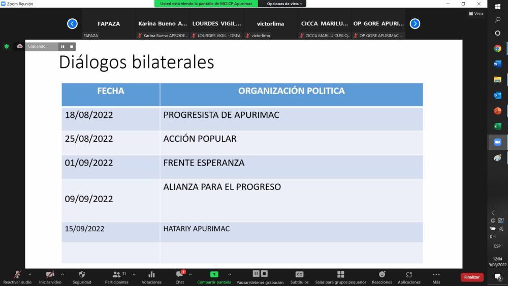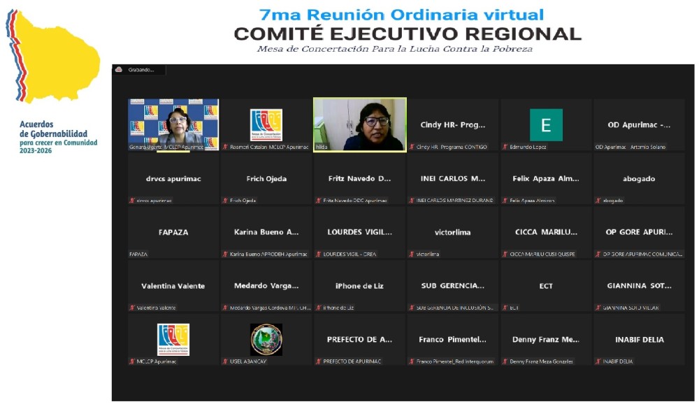El Comité Ejecutivo Regional de la MCLCP Apurímac, en su séptima reunión del mes de agosto, aprobó el cronograma de los diálogos bilaterales con candidatos al Gobierno Regional de Apurímac. Esta fase se desarrollará entre los meses de agosto y setiembre, con la finalidad de dar a conocer la Agenda Regional para la Gobernabilidad 2023-2026 y luego la suscripción de compromisos mediante el Pacto Político Social.