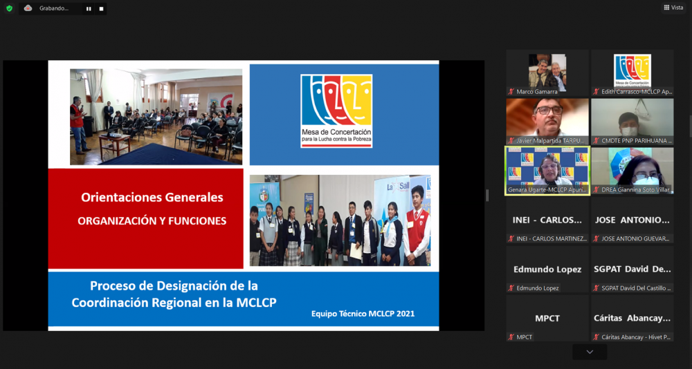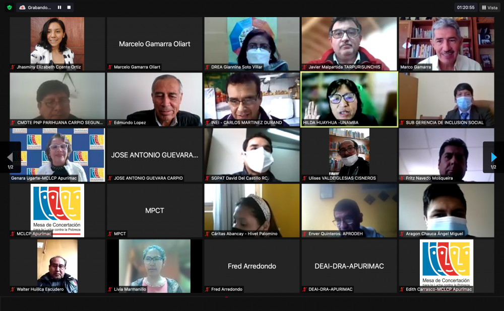 El día 05 de octubre de 2021, a las 10:00 a.m. en Reunión Ordinaria del Comité Ejecutivo Regional (CER) de la MCLCP Apurímac, con la participación de las instituciones públicas y las organizaciones civiles que se encuentran debidamente acreditadas, se realizó la reunión de Renovación de la Coordinación Regional de la MCLCP de Apurímac para el periodo 2021- 2023, la misma que mediante consenso recayó en la Dra. Hilda Huayhua Mamani, representante de la Universidad Nacional Micaela Bastidas Apurímac – UNAMBA.