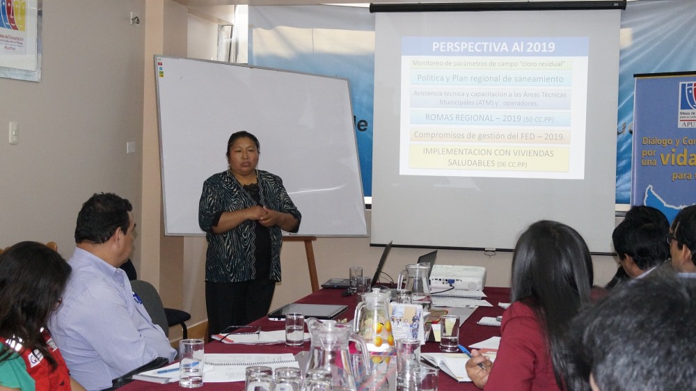 Gladys camino Quispe, de la Dirección Regional de Vivienda Construcción y Saneamiento de Apurímac, presentó los avances sobre agua y saneamiento en la región Apurímac y detalló la situación real de las instalaciones y los yacimientos de agua. Resaltó la importancia de implementar la política nacional de saneamiento, el Plan Regional de Saneamiento de Apurímac, y desde luego mejorar el acceso al agua potable, servicios básicos.