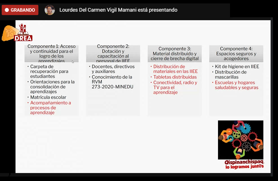 En su presentación, la directora señaló cuatro componentes básicos para asegurar una educación de calidad y superar las brechas educativas: el acceso y continuidad para el logro de los aprendizajes, capacitación al personal de las instituciones educativas, distribución de materiales y cierre de brecha digital, y la generación de espacios seguros y acogedores para los NNA. Luego de la presentación de la visión al 2021, como línea de tiempo para el cumplimiento de las acciones durante este año; se dio apertura a las intervenciones de las Instituciones y organizaciones de sociedad civil presentes, en cuyas intervenciones asumieron compromisos desde su sector para el buen retorno al año escolar 2021.