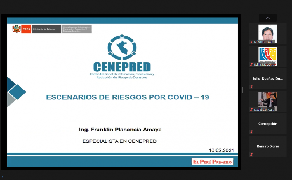Se contó con la exposición del Ing. Alfredo Zambrano Gonzáles Subdirector de Gestión de la Información del CENEPRED, quien detalló la metodología para la construcción de escenarios de riesgo por COVID-19, a través de experiencias realizadas en Ica y otras zonas.