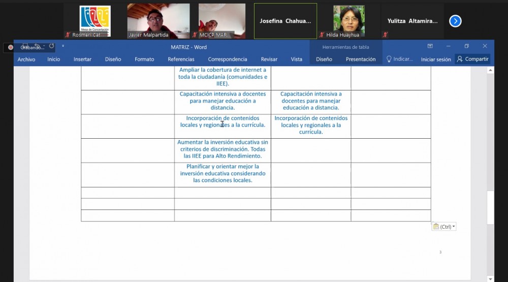 La consulta regional, se realizó de manera virtual y fue presidida por Marco Gamarra Samanez, coordinador regional de la MCLCP Apurímac, quien manifestó que este evento es una oportunidad para desarrollarnos como ciudadanos y ser partícipes de las decisiones de las autoridades, en todo aquello que tiene que ver con nuestros derechos. Asimismo, agradeció el espíritu participativo de quienes acompañaron los grupos de trabajo.
