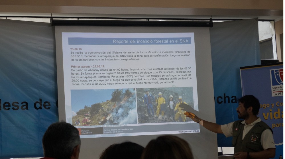 Seguidamente el jefe del Santuario Nacional del Ampay -SERNANP, Biól. Jaime Valenzuela Trujillo, socializo un informe detallado del incendio forestal reportado el 23 de agosto en el Santuario Nacional del Ampay, siniestro que duro 3 días, para finalmente ser controlado y liquidado al 100%, sin embargo se reportó daños tales como: pérdida de aprox.200 ha. de cobertura vegetal, principalmente pajonal de puna; pérdida de hábitat de muchas especies asociadas a pajonal de puna y bosques enanos; incremento de emisiones de CO2 en el aire; impactos negativos en la provisión de servicios eco sistémicos asociados al pajonal de puna y los bosques enanos y afectación al paisaje del SNA.