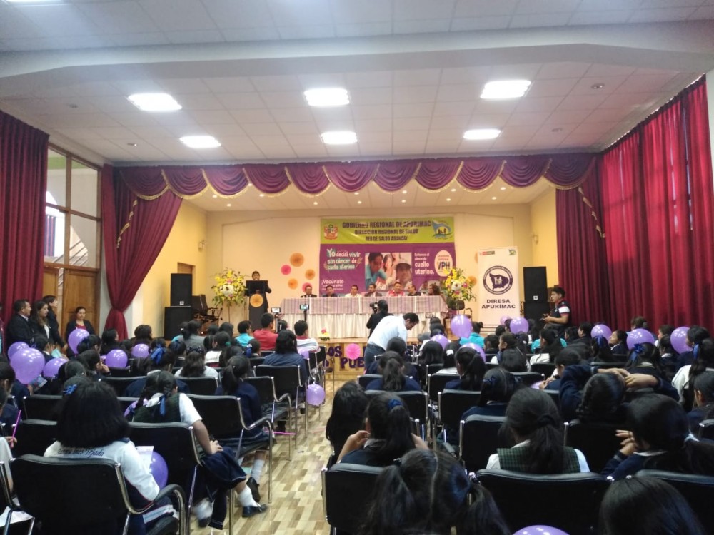 Con la participación de alumnas de la Institución Educativa, Aurora Inés Tejada, autoridades del Gobierno Regional, la Dirección de Salud, la Ugel, la Red de salud de Abancay, la MCLCP Apurímac, y padres de familia, se llevó a cabo el 05 de abril, el lanzamiento de la vacunación contra el Virus Papiloma Humano (VPH).