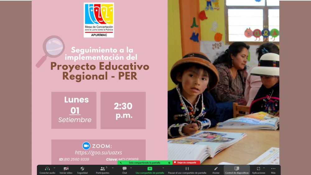 La Mesa de Concertación para la Lucha contra la Pobreza – Apurímac, en coordinación con la Dirección Regional de Educación (DREA), llevó a cabo una reunión virtual con el propósito de analizar los avances y desafíos en la implementación del Proyecto Educativo Regional (PER).