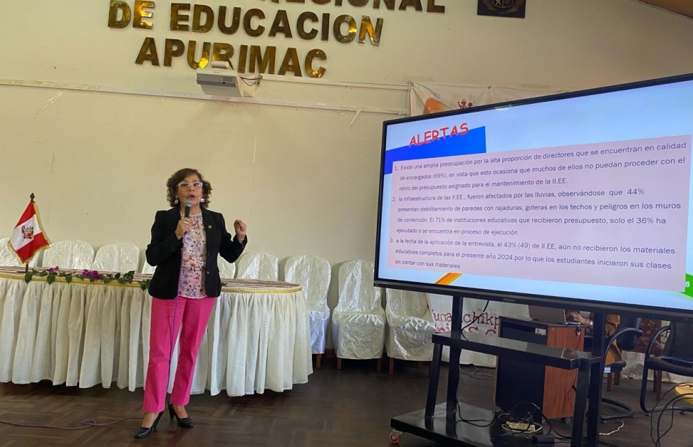 Además los resultados expusieron que en la mayoría de escuelas hay directores en situación de "encargados"; además, el 44% de las II.EE que presentan afectaciones por las lluvias y los escasos recursos para el mantenimiento se han ejecutado en 36%; en relación a los materiales educativos sobre todo los cuadernos de trabajo, el 43% de instituciones educativas no lo recibieron de manera completa y el 67% de las II.EE no cuentan con servicio de internet; asimismo el 55% de los CAEs no recibieron capacitación y en relación a la GRD, para ello se requiere reforzar y actualizar las brigadas de Defensa Civil.