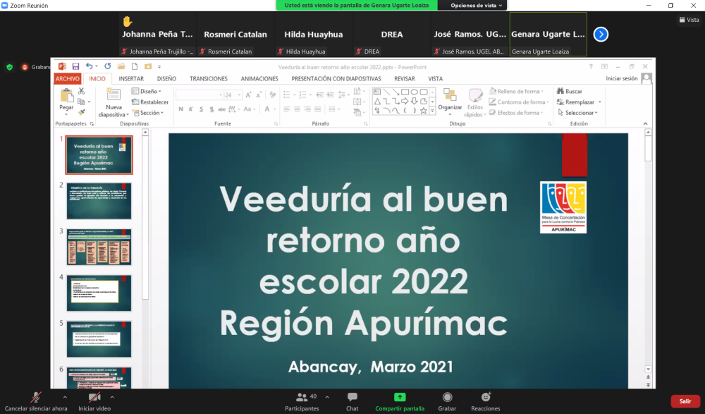 El último martes 01 de marzo, se llevó a cabo la 2da reunión del Comité Ejecutivo Regional (CER) de la Mesa de Concertación para la Lucha contra la Pobreza de Apurímac, con el objetivo de dialogar sobre la Coyuntura Nacional, Regional; la situación del retorno a clases presenciales y la Planificación para el Proceso del Acuerdo de Gobernabilidad.