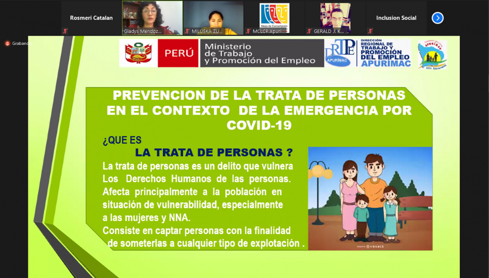 Con el objetivo de iniciar acciones para la reactivación de la Red de lucha contra la trata de personas y tráfico ilícito de migrantes y personas desaparecidas en la región Apurímac se realizó la Primera reunión virtual contra la Trata de Personas, para informar sobre la normativa y avances en la implementación del Plan Nacional Contra la Trata de Personas 2017-2021, en nuestra región.