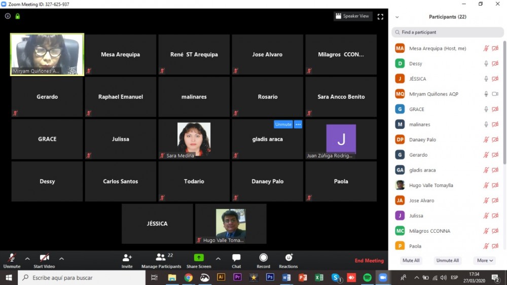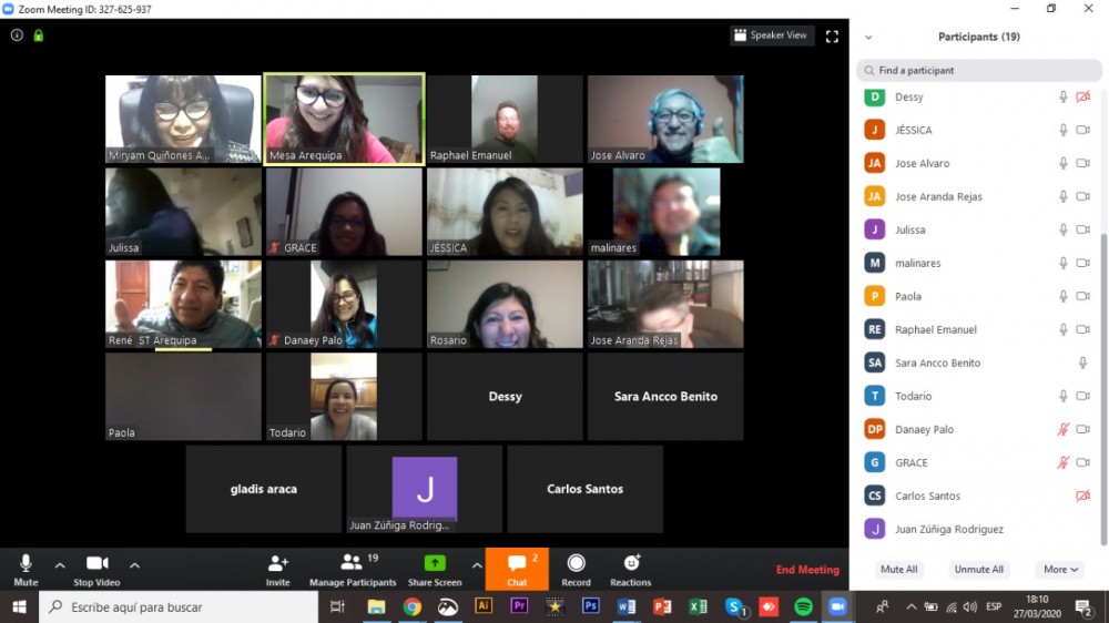 Respetando las disposiciones de emergencia nacional por el COVID-19, el día 27 de marzo siendo las 16:30 horas y en el marco del seguimiento concertado del Acuerdo de Gobernabilidad Arequipa 2019 – 2022 se llevó a cabo la sesión ordinaria del Comité Ejecutivo Regional correspondiente al mes de marzo, utilizando la plataforma virtual “Zoom”.