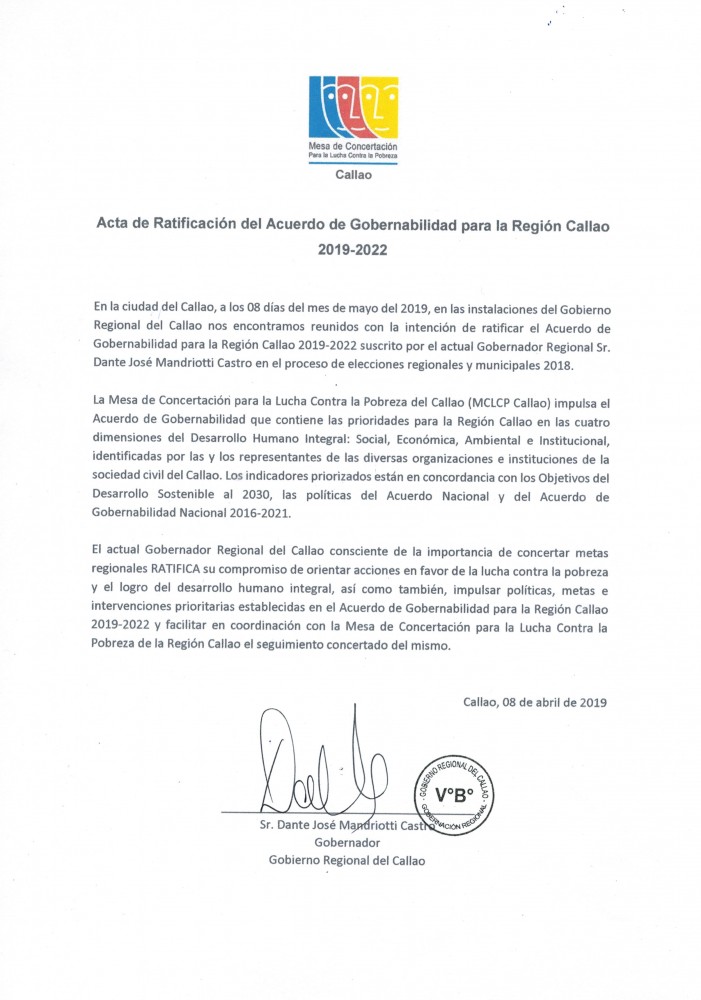 En las instalaciones del Gobierno Regional del Callao, el miércoles 8 de mayo se llevó a cabo la ceremonia de Ratificación del Acuerdo de Gobernabilidad para la Región Callao 2019-2022, suscrito por el actual Gobernador, Dante José Mandriotti Castro, en el proceso de las elecciones regionales y municipales 2018, como candidato al Gobierno Regional del Callao.