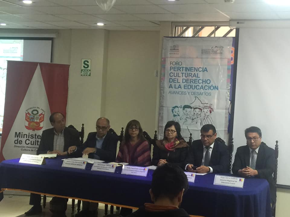 Con la participación de aproximadamente 300 personas y la presencia del Congresista Édgar Ochoa, la Viceministra de interculturalidad Elena Burga, el Director de Eduación Intercultural Bilingue Severo Cuba, la Gerente General del GORE Cusco Nelly Castañeda, el Coordinador de la Mesa de Concertación para la Lucha contra la Pobreza de Cusco Teófilo Silva, autoridades educativas y actores sociales se realizó el Foro: Pertinencia Cultural del Derecho a la Educación, avances y desafíos.