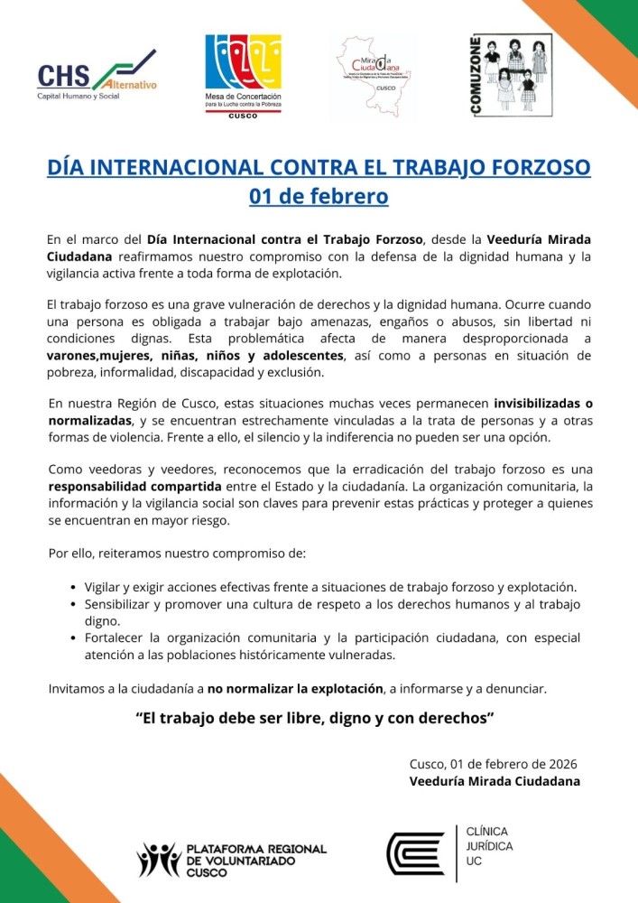 Como parte de la actividad, se suscribió un pronunciamiento conjunto por el Día de la Lucha contra el Trabajo Forzoso, reafirmando el compromiso de las instituciones participantes con la defensa de los derechos humanos y la dignidad de las personas. La MCLCP Cusco conmemora esta fecha reafirmando su compromiso con la defensa de la dignidad humana y la promoción de un trabajo libre, digno y con derechos. El trabajo debe ser libre, digno y con derechos.