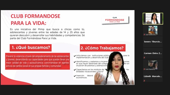El "Club formándose para la vida" es un club dirigido a las mujeres adolescente y jóvenes del distrito de Huánuco para fomentar la participación en servicios que incrementan su autonomía económica y desarrollar competencias para prevenir la violencia.