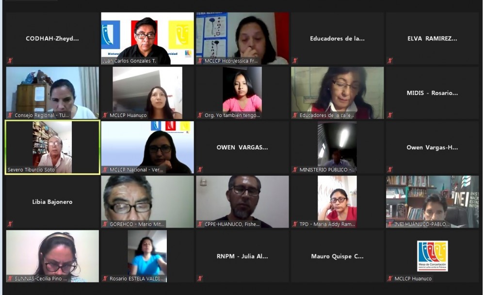 La Mesa de Concertación para la Lucha Contra la Pobreza Huánuco realizó el día lunes 23 de noviembre el Diálogo Virtual por la Infancia: “Los Derechos de la Niñez y Adolescencia en Huánuco”, el mismo que estuvo presidido por Severo Tiburcio Soto, coordinador regional de la MCLCP Huánuco, y moderado por Juan Carlos Gonzales Tacza, secretario ejecutivo de dicha institución.