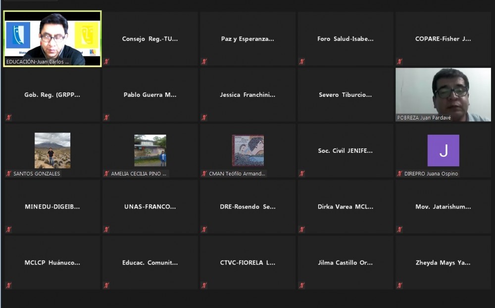 El taller virtual estuvo presidida por el coordinador regional, Severo Tiburcio Soto, acompañado de facilitadores como Juan Pardavé del CTVC (facilitador en el tema de Pobreza), Jessica Franchini (facilitador en el tema de Salud) y Juan Carlos Gonzales (facilitador en el tema de Educación), y contó con el apoyo del equipo técnico de la Mesa Nacional (Dirka Varea y Jimmy Zegarra).