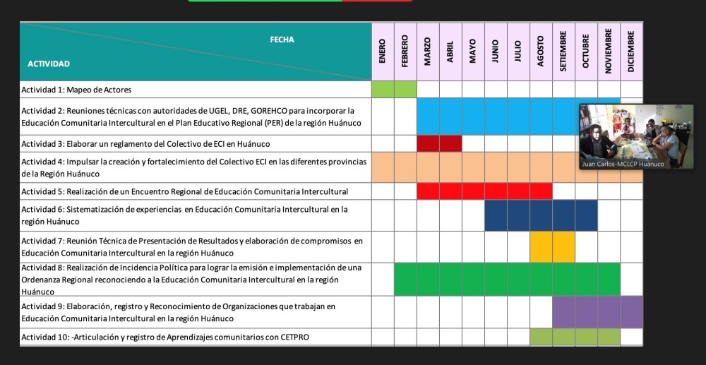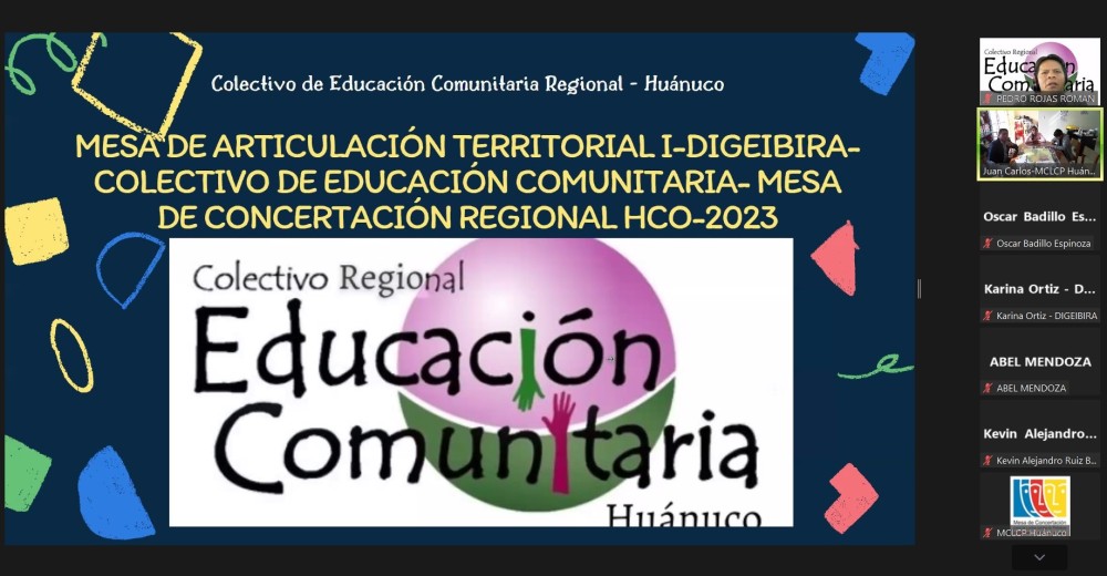 El Colectivo Educación Comunitaria, se reunió de manera presencial y virtual, con la finalidad de articular territorialmente el Colectivo y DEGIBIRA del MINEDU. Para referida reunión se usó la plataforma Zoom y se desarrolló en los ambientes de la Mesa de Concertación para la Lucha Contra la Pobreza (MCLCP) de Huánuco.
