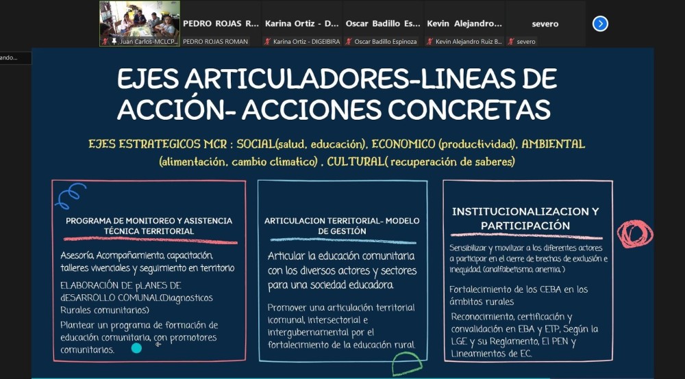 • Estructura de la Mesa de Articulación: Socialización del Plan de Trabajo –CECR, mapeo y registro de actores, organizaciones y colectivos de EC, visibilizar las experiencias comunitarias en el ámbito regional, contextualización y propuestas de articulación del Colectivo Regional y Direcciones de Línea de la IDGEIBIRA.