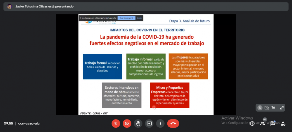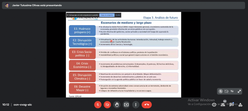 El equipo técnico del gobierno regional presentaron algunas consideraciones a tomar en cuenta, como la formulación de escenarios, los escenarios ambientales frente al cambio climático mundial al 2100, los escenarios proyectados de población, el cono de la plausibilidad, los impactos del COVID, y poniendo énfasis en las particularidades de los escenarios a corto, mediano y largo plazo.