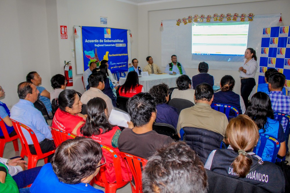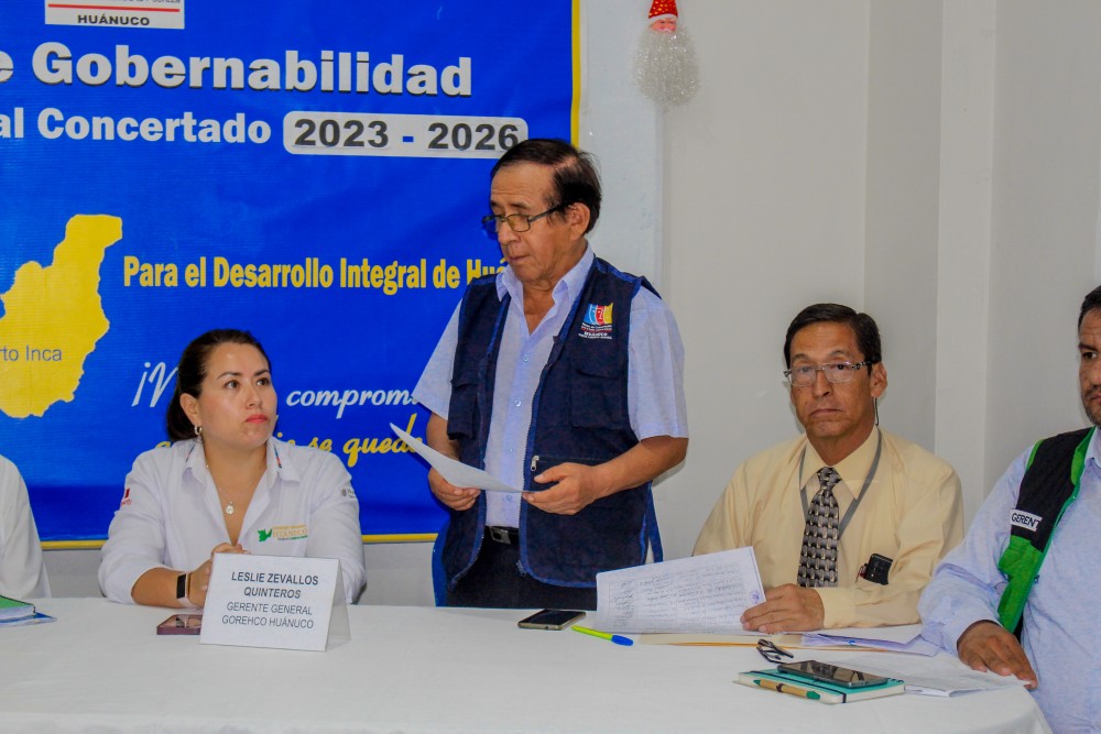 En la reunión ordinaria y cierre de año 2023, la Gerente Regional del Gobierno Regional de Huánuco, Leslie Zevallos Quinteros, en compañía de los Gerente Regionales de Desarrollo Social, Recursos Naturales y Gestión Ambiental, Planeamiento, Presupuesto y Acondicionamiento Territorial, Dirección Regional de Trabajo y Promoción del Empleo, así como de su equipo técnico regional, sustentó ante el pleno del Comité Regional de la Mesa de Concertación de Huánuco, los avances de cumplimiento del Acuerdo de Gobernabilidad (indicadores y cierre de brechas para reducir la pobreza), en los 4 ejes: Social, Económico, Ambiental e Institucional.