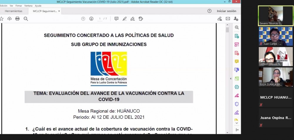 Con la finalidad de realizar la presentación de los documentos: “Seguimiento concertado de la cobertura de vacunación contra el COVID-19 en la región” y “Trabajemos unidos para promover el desarrollo inclusivo, vencer la pobreza, las desigualdades y la discriminación” el día viernes 16 de julio del 2021, se realizó la reunión virtual ordinaria del Comité Ejecutivo Regional de la MCLCP Hco. El Coordinador Regional, ing Severo Tiburcio Soto procede a dar las palabras de bienvenida a los actores presentes, apertura la reunión y da a conocer la agenda siguiente: