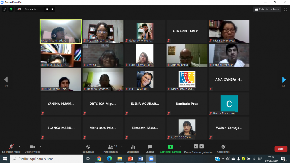 Los eventos se realizaron los días 24 y 30 de setiembre del 2020, y en ellas participaron un total de 60 personas, representando a instituciones como la Gerencia de Desarrollo Social del GORE, municipalidades provinciales y distritales, colegios profesionales, organizaciones de mujeres, CCONNA Regional, Alcaldes escolares, FED, Organización de las Personas Adultas Mayores, miembros del CER-MCLCP Ica, Mesas Locales y líderes de la comunidad.