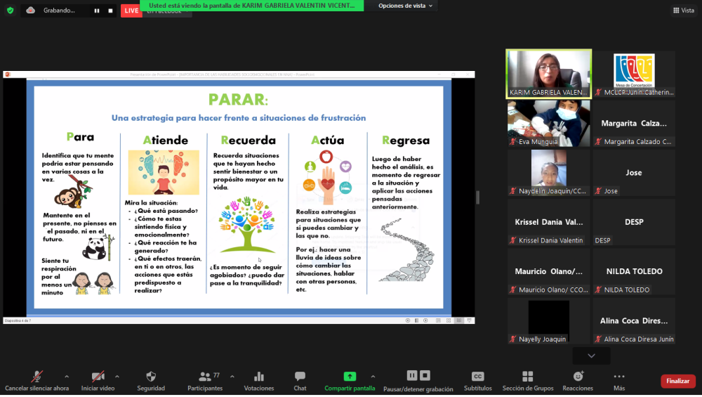 La especialista presentó ejemplos sencillos y de la vida cotidiana para animar a niñas, niños y adolescentes a practicar actitudes positivas como la empatía, la compasión y la inclusión; ya que estos dos años no se han podido relacionar con sus pares. Y comparte con los asistentes el cuento Sachakuna, el bosque de las emociones, enseñando a niñas, niños y adolescentes a controlar las emociones como son la ansiedad, el miedo, la alegría, la cólera y la tristeza con la estrategia “parar y respirar”.