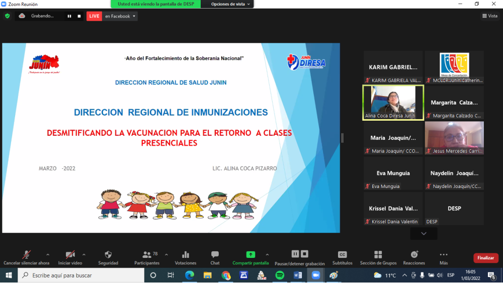 La directora de la Estrategia Regional de Inmunizaciones de la Dirección Regional de Salud Junín, Alina Cecilia Coca Pizarro, presentó alcances sobre la importancia de la vacunación “Desmitificando la Vacunación para el retorno a Clases Presenciales”. La vacuna es una preparación destinada a generar inmunidad, por lo que, previene enfermedades infecciosas, y así, evitar millones de muertes; informa también, que en el Perú se aplican 17 tipos de vacunas para controlar 26 enfermedades, explicó.