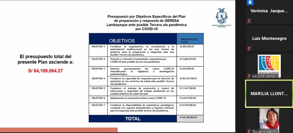 En reunión extraordinaria del Comité Ejecutivo Regional de la MCLCP-Lambayeque, la Gerencia Regional de Salud (GERESA) presentó el plan de respuesta frente a una posible tercera ola por COVID-19 en la región.