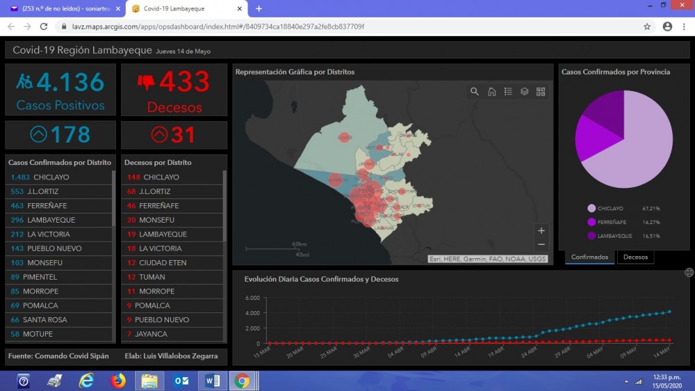 A través de este mapa interactivo se podrá ver la evolución de la pandemia diariamente a nivel de cada uno de los distritos de la región Lambayeque. Ver mapa en el siguiente enlace: https://arcg.is/1y1mbu.