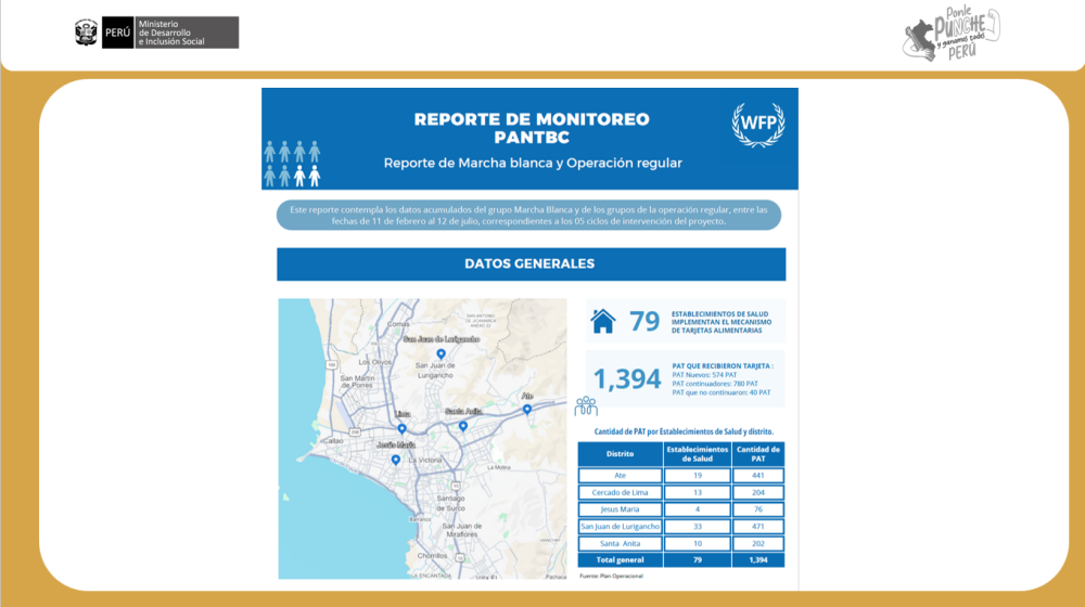 Durante el encuentro, Arturo Granados, representante del Programa Mundial de Alimentos (PMA), presentó los resultados de la cuarta entrega de tarjetas y los avances del nuevo mecanismo de apoyo alimentario. Precisó que, a la fecha, 1,394 PAT han recibido alimentos mediante tarjetas en cinco distritos de Lima Metropolitana (Ate, Cercado de Lima, Jesús María, San Juan de Lurigancho y Santa Anita). Asimismo, se brindó teleorientación a 948 PAT, según el monitoreo realizado. Sobre la programación 2026 y el posible escalamiento del mecanismo, se informó que la propuesta fue remitida al Ministerio de Economía y Finanzas, aunque aún no se cuenta con respuesta oficial.