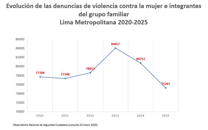 La reunión fue moderada por María del Carmen de la Vega, coordinadora del grupo, quien junto a las y los integrantes analizó la evolución de las cifras de denuncias por violencia contra la mujer e integrantes del grupo familiar en Lima Metropolitana. Se informó que en 2023 se registró un pico de 84,057 denuncias, cifra que descendió ligeramente a 75,607 en 2025.