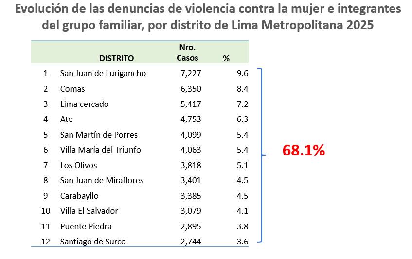 El análisis estadístico reveló que el 68.1% de las denuncias se concentra en 12 distritos, siendo San Juan de Lurigancho (9.6%), Comas (8.4%) y Lima Cercado (7.2%) las jurisdicciones con mayores índices de violencia reportada. Frente a esta situación, el grupo acordó focalizar el seguimiento concertado al funcionamiento de las Instancias Distritales de Concertación (IDC) en estas zonas e incidir en la asignación de presupuesto para acciones de prevención en el marco del Programa Presupuestal 1002 (PPoR).