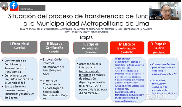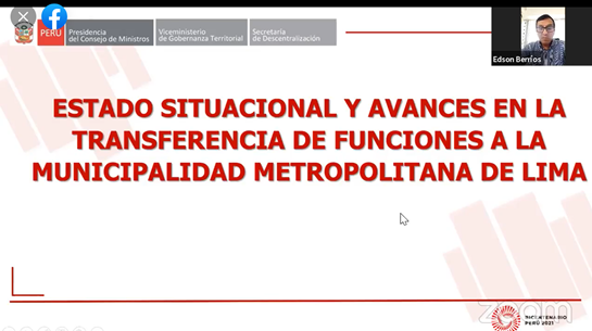 Por su parte, Edson Berrios, de la Secretaria de Descentralización (SD) de la Presidencia de Consejo de Ministros (PCM), sobre el estado situacional de la transferencia de educación, informó que desde el 2014 se cuenta con la RSD N° 025-2014-PCM/SD, que acredita las funciones descritas en el artículo 47° de la Ley N° 27867, Ley Orgánica de Gobiernos Regionales, en materia de Educación, Deporte y Recreación, a la MML y que el proceso se encuentra en la última etapa que es la de EFECTIVIZACIÓN, que está a cargo del MINEDU y la MML.