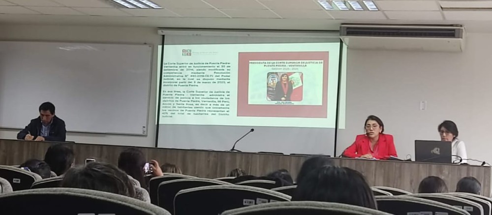 La representante de la Corte Suprema de Justicia Puente Piedra-Ventanilla, Katherine Stephanie Zarate, informó sobre las acciones que se desarrollan como parte de los cinco objetivos de la Estrategia Nacional de Implementación del Sistema Nacional Especializado de Justicia para la Protección y Sanción de la Violencia contra las Mujeres e Integrantes del Grupo Familiar (SNEJ) y de las acciones que se desarrollan desde los Módulos de Protección y Módulos Penales, con sus correspondientes juzgados penal y de protección que conforman el denominado SNEJ.