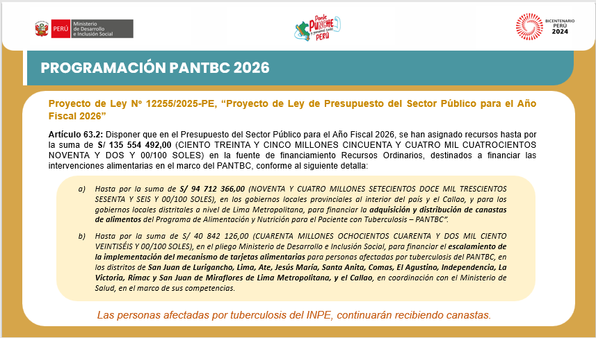 Lima, 24 de octubre de 2025.- El Subcomité del Programa de Alimentación y Nutrición para Personas Afectadas con Tuberculosis (PANTBC) de la Mesa de Concertación para la Lucha contra la Pobreza (MCLCP) de Lima Metropolitana realizó su V Reunión de Trabajo presencial, con el propósito de dialogar sobre los avances en la implementación del mecanismo de tarjetas alimentarias, la cobertura de canastas PANTBC para el último trimestre del año, la actualización del sistema de reportes, la programación para el 2026 y el intercambio de experiencias sobre mejoras en la canasta alimentaria.