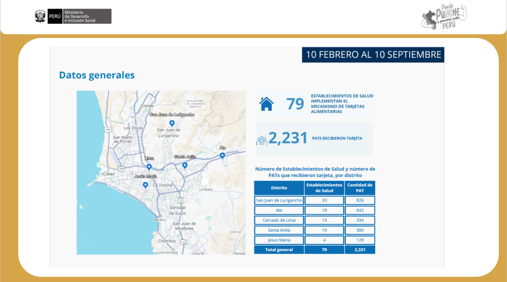 Por su parte, Arturo Granados, representante del PMA, presentó los principales resultados del periodo comprendido entre febrero y octubre de 2025, destacando la entrega de 2 231 tarjetas a Personas Afectadas con Tuberculosis (PAT) atendidas en 79 establecimientos de salud de los distritos de Ate, Cercado de Lima, Jesús María, San Juan de Lurigancho y Santa Anita.