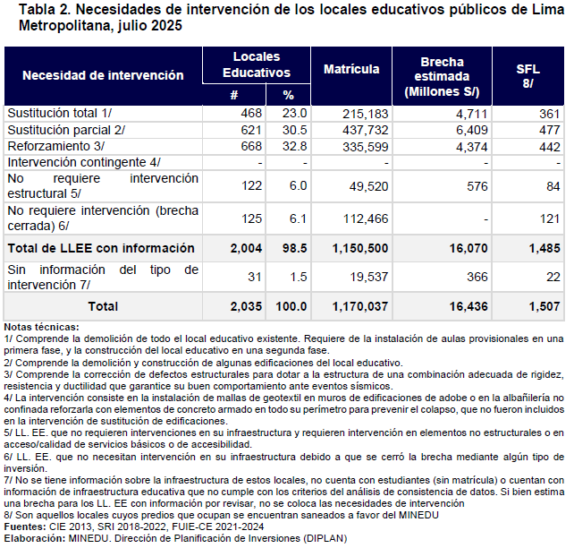 En la primera parte de la jornada, César Fasshauer, representante de la Dirección de Planificación de Inversiones (DIPLAN) del Ministerio de Educación, presentó un panorama sobre la infraestructura educativa en Lima Metropolitana. Al 31 de julio de 2025, se registran 2,035 locales educativos públicos que atienden a 1,170,037 estudiantes. De este total, 468 locales se encuentran en situación de muy alto riesgo de colapso, lo que representa un serio desafío, ya que los criterios normativos actuales no consideran la magnitud de estudiantes afectados como variable prioritaria en la atención inmediata.