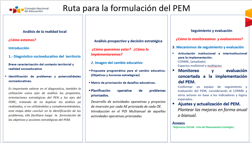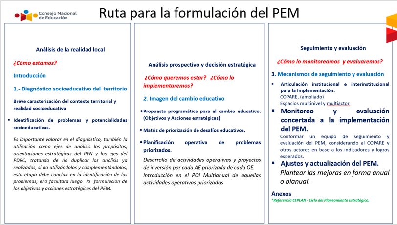Sobre la relacionada con la agenda del Proyecto Educativo Metropolitano (PEM), Eduardo Sáenz, representante del Consejo Nacional de Educación – CNE, hizo una exposición sobre los principales instrumentos de gestión de la educación y el contexto particular que tiene Lima Metropolitana, que no cuenta con un PEM, como sucede en las regiones. Asimismo, expuso sobre una propuesta de ruta para la formulación del PEM en Lima Metropolitana, así como las condiciones estratégicas para la educación en este territorio.