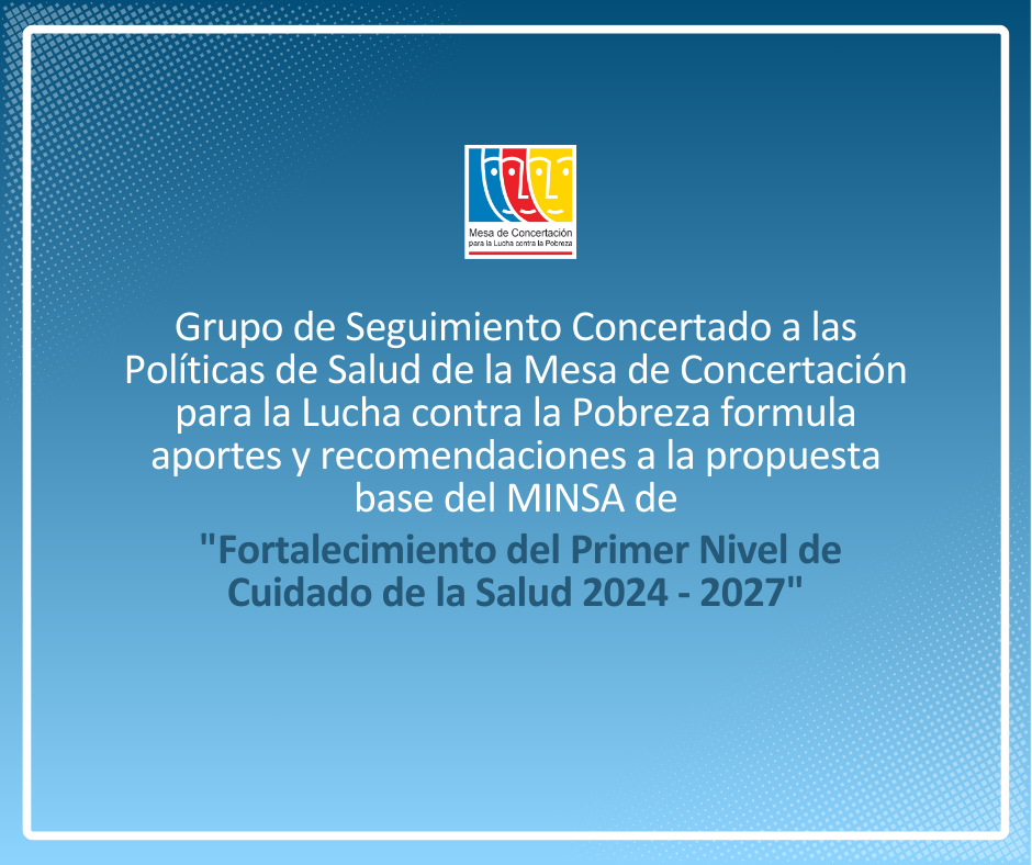 Las instituciones del Estado, sociedad civil y cooperación que integran el "Grupo de Seguimiento Concertado a las Políticas de Salud" de la Mesa de Concertación para la Lucha contra la Pobreza-MCLCP, formulan aportes y recomendaciones a la propuesta base del Ministerio de Salud denominado “Libro Blanco de Fortalecimiento del Primer Nivel de Cuidado de la Salud 2024/2027. En el marco de las Redes Integradas de Salud".