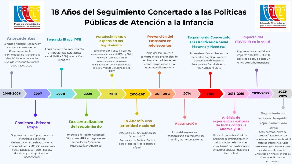 Durante el espacio conmemorativo, el presidente de la MCLCP, Federico Arnillas Lafert, y la coordinadora del Grupo de Seguimiento Concertado a las Políticas de Salud, Wendy Albán, presentaron una línea de tiempo que recogió los principales hitos del seguimiento concertado a las políticas de atención a la infancia entre los años 2007 y 2025, destacando su contribución a una mejor implementación de las políticas públicas en salud.